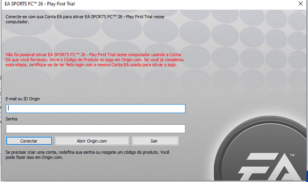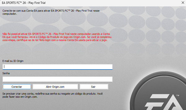 Estou tentando jogar o EAFC26 desde as 9 da manhã. Quando eu tento entrar no jogo, fica informando que eu tenho que ativar a chave do produto, e quando eu coloco a conta onde tem a EAPlay, e onde eu comprei o jogo, fica informando que não foi possível se conectar. Segue a baixo a mensagem que aparece quando tento iniciar o jogo