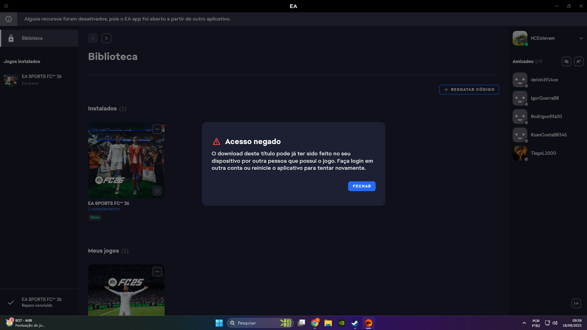 O problema ao iniciar os testes do FC 26 EA Play e EA Play Pro no PC foi resolvido.