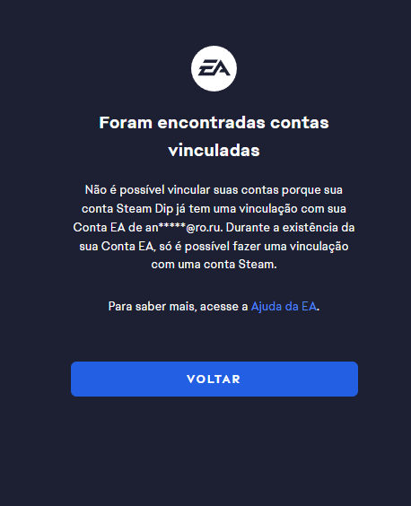 Eu estou tentando jogar um jogo que é da EA na minha steam, e ele pede pra mim baixar o aplicativo da EA, então baixei e criei a conta EA, porém quando fui vincular, apareceu que minha conta steam já havia sido vinculada a uma conta EA, e eu não tenho acesso ao tal email vinculado