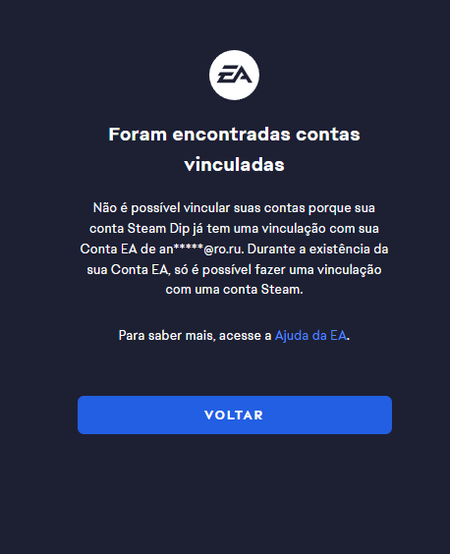 Eu estou tentando jogar um jogo que é da EA na minha steam, e ele pede pra mim baixar o aplicativo da EA, então baixei e criei a conta EA, porém quando fui vincular, apareceu que minha conta steam já...