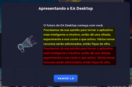 O momento em que essa mensagem de boas-vindas apareceu, espontaneamente, foi durante o "TOUR", onde são destacados algumas partes da interface.