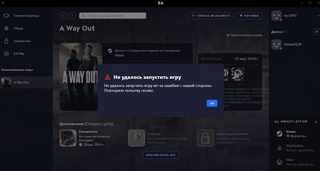 my119928 months agoSolvedНе включается игра A Way Out через EA Покупал игру A Way Out зимой 2024 года после прохождение игры я ее удалил , и вот щас установил но зайти я не могу почему то , выдает ошибку Show MoreEA_Yafo8 months agoЗдравствуйте my11992 Вы не пробовали делать Восстановление файлов игры и отключать параллельно запущенные программы?