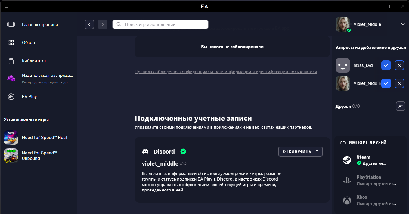 Недавно зареестрировал аккаунт, купили с другом NFS Heat, отправили друг другу запрос в друзья, запросы не приходят, танцы с бубном по очистке кеша, перезапуском, перезаходом и т.п. дали только высвечивание заявки, но принять её само приложение не даёт, идёт загрузка после принятия и заявка в друзья так и висит, самое тупое что нашёл себя и сам себе запрос в друзья закинул, который так же висит мёртвым грузом. Что делать? Внутри игры статус вне сети, хотя друга пригласил в свою команду и этот запрос он спокойно принял, а при инвайте в группу внутри игры запросы так же не приходят... У обоих сверили все настройки нофиндециальности, причин для такого тупняка нету, а они есть