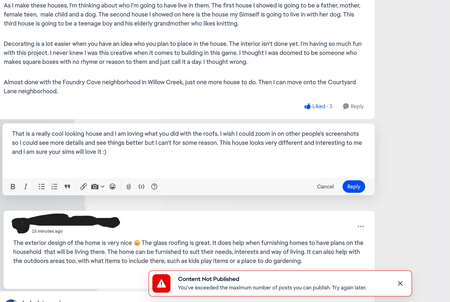 I've been a member of the different sims forums for well over 16 years and they only allow me to make a few posts before blocking. It is totally ridiculous. Like you say, how are you supposed to respond to existing threads already participated in? And when is 'later'? An hour? Two? Just some random time, whatever it feels like on any given day?
