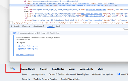 Sawtooth75Seasoned Ace5 months agoSolvedEA logo does not load due to CORB The EA Logo in the footer does not load due to Cross-Origin Read Blocking: Tested on Chrome for Windows Version 138.0.7204.184 Show MoreEA_Nils27 days agoThanks for pointing that out, should have been fixed since.