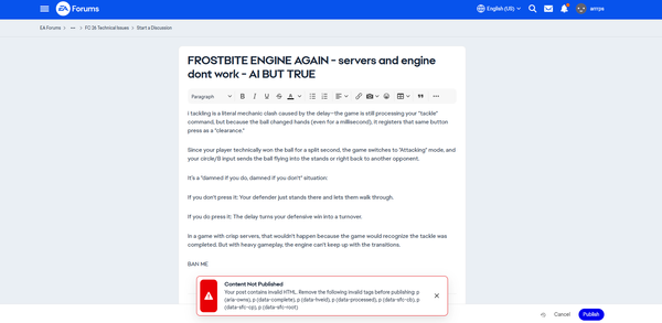 Recent DiscussionsInvalid html error on forum post [CM - Edited title for clarity, moved boards] EA Forums links are not navigating I am on the EA Forums for The Sims 4 Bug Reports and was trying to submit a new bug related to the Lost Legacies event. None of the navigation links on this forum seem to be working. They change th...What purpose does the EA forum serve? What purpose does the forum or any "support" entity of EA even serve? In the information age, you cant get prompt responses on game-specific forums here, and of all the threads I have read in this ar...The new forum As someone who has been active on the old forums I would like to share my feedback on this one. My first encounter with this forum was on my mobile because I was on holiday during the switch from the...Is there a way to change my username to the one I used on the forums? Maybe I am blind but as far as I can tell I can't change my username. However, I always used a different one on TS forums and I'd like to use that same one here too. Is there a way to change it or t...