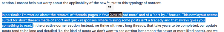 In particular, I'm worried about the removal of threads' pages in favour of a "load more" and of a "sort by..." feature. This new layout seems suited for short threads made of short and quick responses, where missing some posts isn't a tragedy and that always gives you something to read.