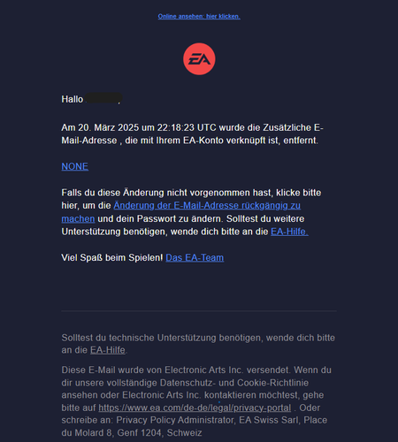 Recent DiscussionsAltes EA Konto von PSN Konto trennen Hi Zusammen, ich habe auch das Problem, dass mein PSN Konto noch mit einem uralten EA Konto verbunden ist, auf das ich keinen Zugriff mehr habe. Gibt es bei EA keinen Support, bei dem man mit einem...Konto Verknüpfung trennen Disabled Hallo zusammen, ich wollte mein PSN Konto mit meinem EA-Konto verknüpfen, aber bekomme ständig die gleiche Fehlermeldung. Wie kann ich das trennen? Ich habe keine Ahnung was für eine Mail das ist, a...Konto löschen Ich möchte meinen EA Konto löschen aber das Problem ist die Email die in meinem EA Konto drin ist gibt es nicht mehr ich muss mich immer mit meinem PlayStation Konto anmelden ich kann EA auch nic...Der Account wurde gehackt. Ich habe folgendes Problem: Mein Account wurde gehackt und mein Xbox Gamertag ist mit einer fremden E-Mail-Adresse verknüpft, auf die ich keinen Zugriff habe. Ich habe den Support von EA angeschriebe...Pro club und seasonpass am Sonntag Nachmittag wurde meine E-Mail-Adresse durch den EA-Kundendienst geändert. Seitdem treten mehrere Probleme auf: – Pro Clubs lässt sich nicht öffnen (Serververbindung fehlgeschlagen) – Se...