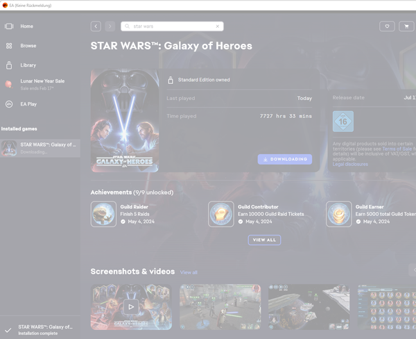 Die App startet dann wieder sofort. Ich gehe zu browse suche Star Wars Galaxy of Hero. Starte den Download. Das Spiel wird erfolgreich installiert und dann friert die App wieder ein.
