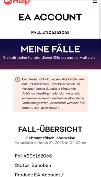 Guten Tag, kann mir jemand helfen ? Mein Konto wurde fälschlicherweise deaktiviert/ Bann bekommen und bei meinem Fall hat EA nach 2 Tagen den “Status” auf behoben aktualisiert und ich kann immer no...