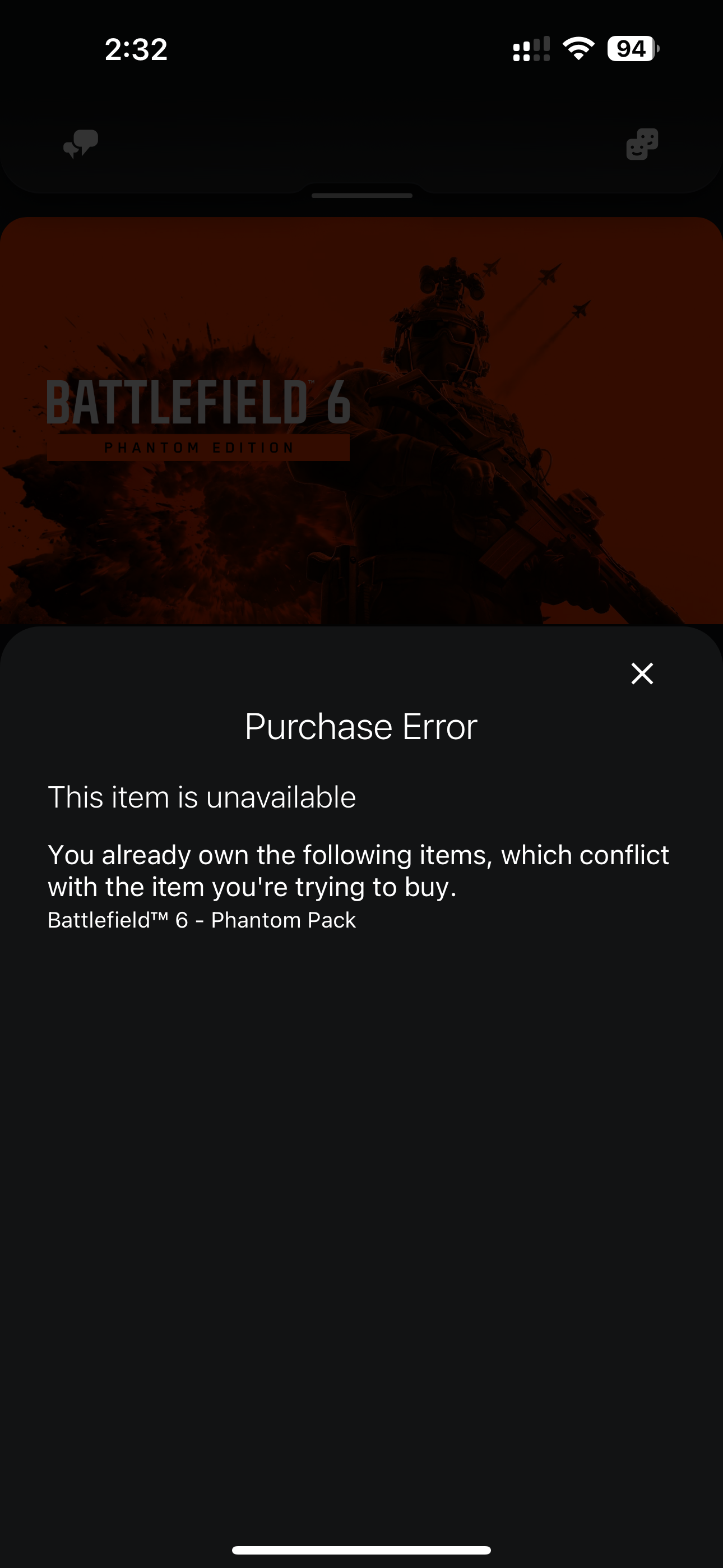 “This item is unavailable. You already own Battlefield 6 – Phantom Pack.