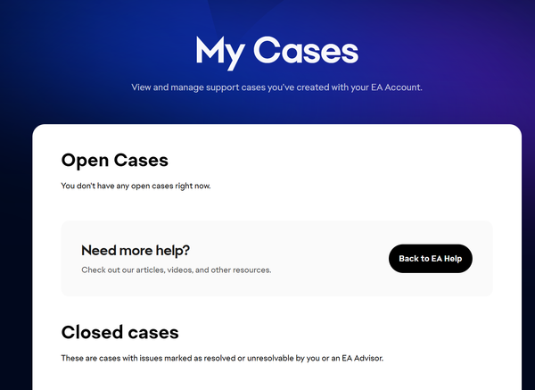 However, when I check the “My Cases” section in my EA account, there is no new case at all — only my older, already-closed cases appear.