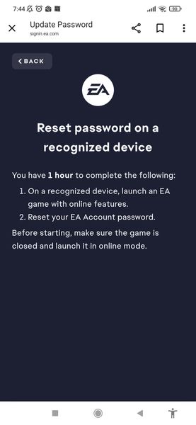 I wanted to reset my password, but it keeps redirecting me to the message below. I opened the game from the console, but nothing changed. I wanted to contact EA support, but there was no live supp...