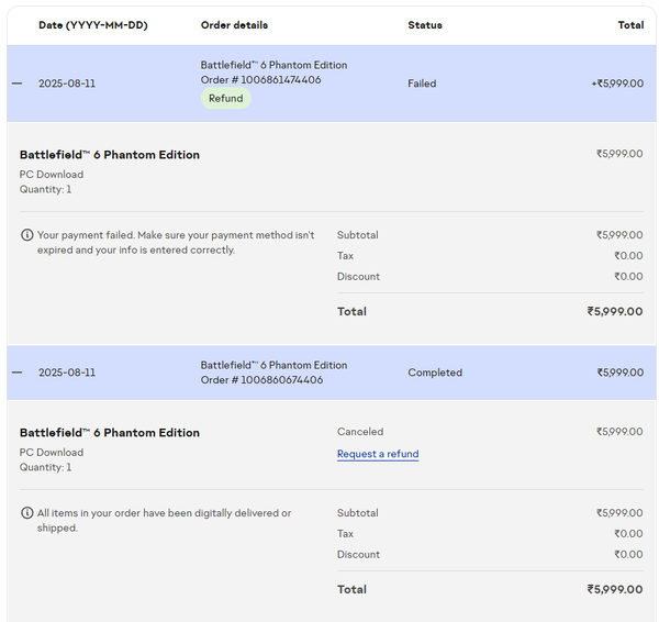 I experienced this issue - I bought Bf6 phantom edition pack 2 months ago on 11 august and tried getting a refund within 12 hours after purchasing it EA denied my request and told me that refund is not possible and wasted 20+ days of mine going back and forth with their support after the refund request was denied they told me that they will add the game back to my library so they did that but after the game got launched I couldnt play it because it keeps giving me error that I dont own the game even tho it was in my library so I stayed on kept going with their support for over 2 weeks and yesterday I got the option enabled on refund tool to refund the game back and now its in processing state but I still haven't got the money back so I'm waiting few more days