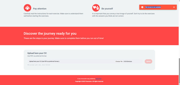 I've recently applied for a game tester job in Madrid, but when I got my email to log in to the The Key Talent platform to take the Videogame Tester, I couldnt even start it because the system wouldnt accept my CV. It kept saying "File format is not available" even though my CV was in PDF format, exactly like the website asked.
