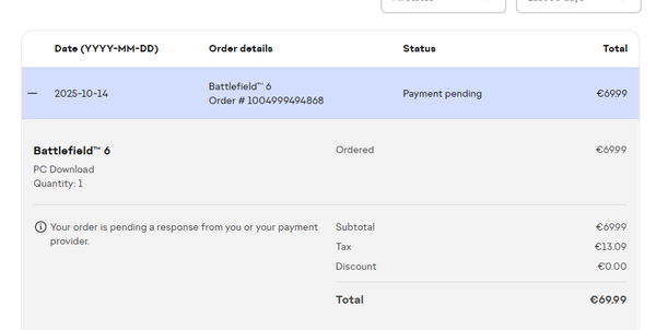 I just  bought the BF6 game an hour ago, and it says the payment is reserved and not confirmed by EA Games. ;)