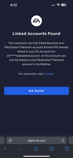 Below is the error I’m getting when I attempt to link my PlayStation account to my EA account. The email listed has “@disabled.ea.com”, which certainly indicates it is not a real email. I have no i...