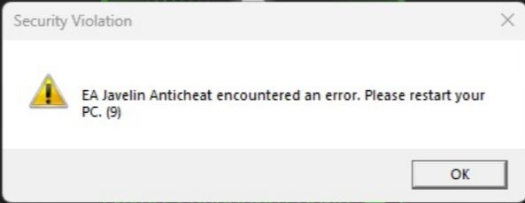 I've been strangling for about 4 DAYSSS! with trouble issue says " EA Javelin Anticheat encountered an error. Please restart your PC.(9)" Even i did everything to solution this issue but it doesn't work!!!!!!