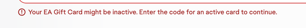 Nu wilde ik ze vandaag via mijn EA Wallet verzegelen en als ik de code in voer (waarvan ik die op de kaart had moeten wegkrassen) wordt er gezegd dat het geen geldige code is. De code die op de kaarten staan zijn allemaal cijfercodes van 15 cijfers lang. Geen (hoofd)letters er tussen. Ik heb een screenshot bijgevoegd van wat de precieze foutmelding is.