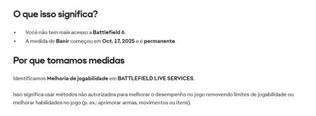 No dia 17/10 ao logar no jogo, recebi a mensagem que minha conta tinha sido banida por alguma violação Não sei do que se trata, nunca usei nenhum artificio dentro do jogo e abri a constestaç...