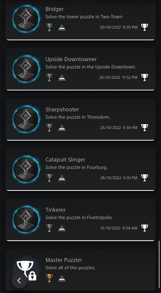 I just completed the Game on PS5 and i have one Trophy that did not unlocked my Platinum. The trophy is " Master Puzzler" and i have completed all six puzzles required to get it still it did not unlocked itself. I saw some more people with this problem online, I hope there will be a fix for it soon.