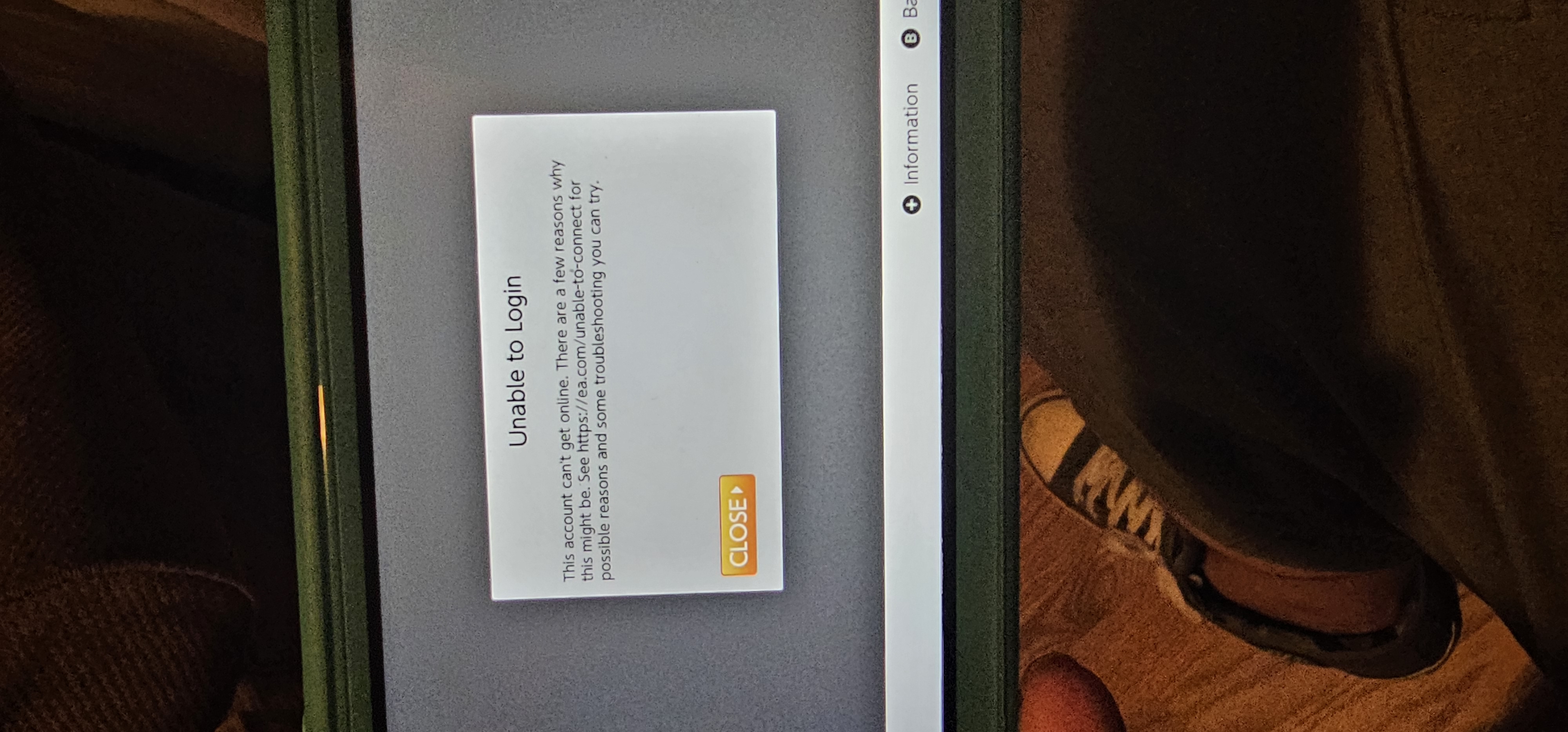 - I am having the same issue with my daughter's game. It will give me an error. The attached screenshot is below. When I put the game in my switch. It works fine, it asks me to enter my ea account information. We are on the same network, and I checked all the steps you posted, still not resolved.