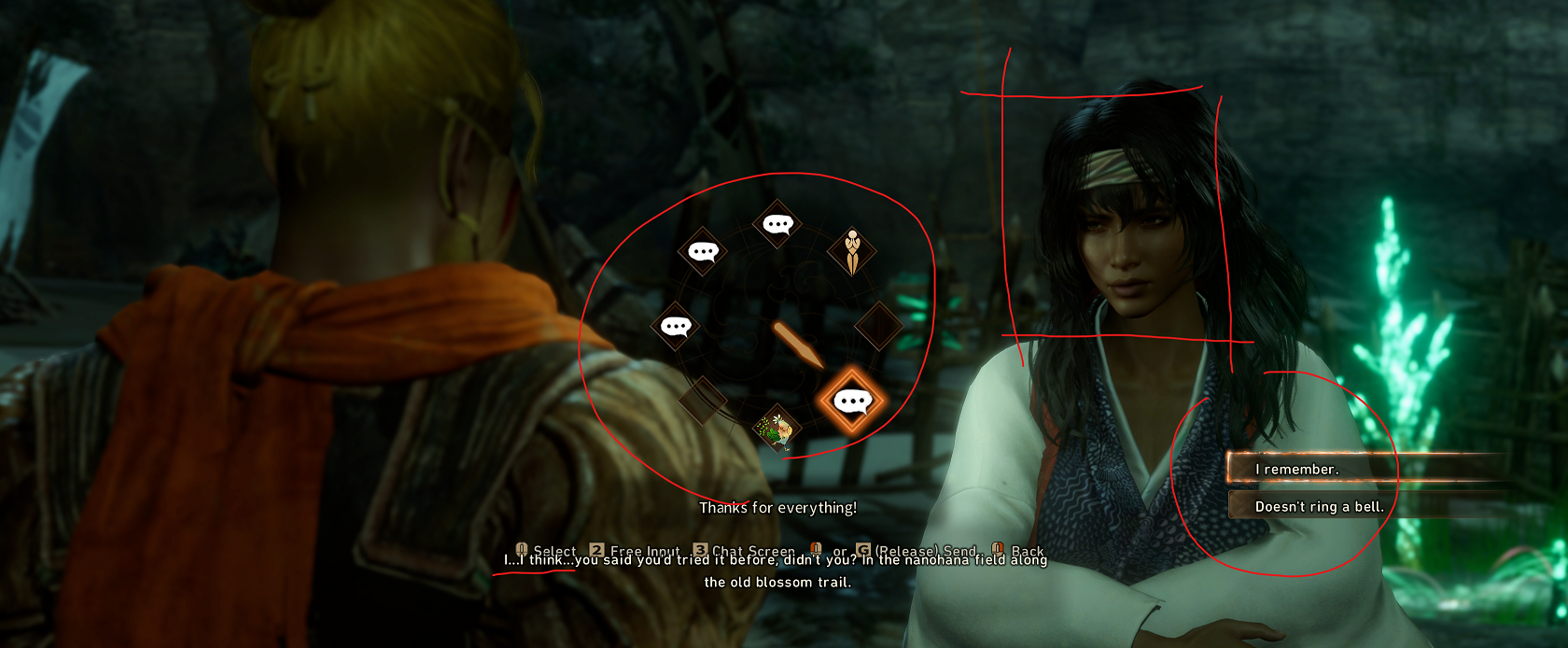 Finished the Dreadclaw fight with an Assist - and I went to bow to him at the end of the timer, but it ended before I could click the button ... then it immediately threw me into my game, which there was the quest to take the boat to the new island, and I think something about killing a kemono that's blocking water or something. The game timed out of the assist match, respawned me into the initial entry of the quest when the lady is sea-sick from the boat ride and she asks a question - and I can't answer it, because the emote wheel is still locked onto the screen and I can't click either button or anything for that matter.