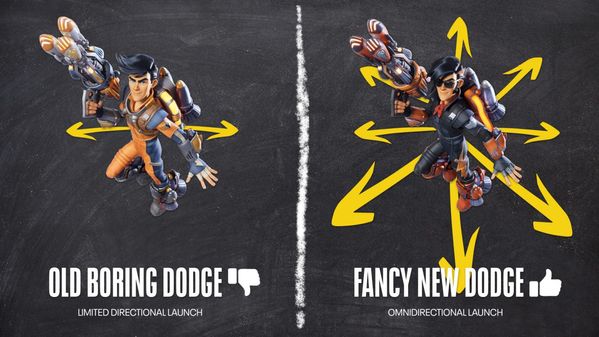 The previous version of Dodge was already useful at avoiding damage, and could even be used in specific situations to safely reach an objective or recover back to solid ground. However, its movement capabilities were restricted to a single horizontal plane. The player could only go left, right, forward, or back. It also barely displaced the player from their previous position, which often left players in the same precarious situation they were in before they Dodged.