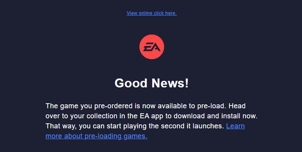 bazsivirag1, Thanks for sharing the screenshot. The game isn't actually supposed to be available for pre-load on the PC EA app, so it's strange that you received an email saying otherwise. The game is available for pre-load on PC, Steam, and Xbox, but not on PlayStation, for example. Apologies for the confusion, and I'll make sure to pass this along to the teams to investigate why that email was sent out.