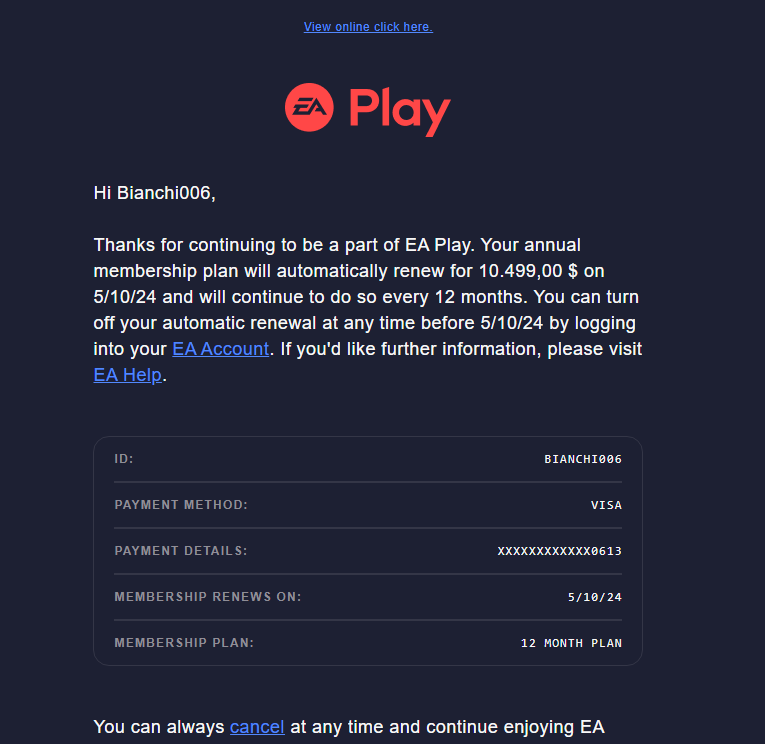 El día 04/09/2024 me mandan un correo desde EA diciéndome que me iban a renovar la membresía de EA PLAY PRO por el mismo precio que el año anterior (AR$ 10.499) el día 05/10/2024.