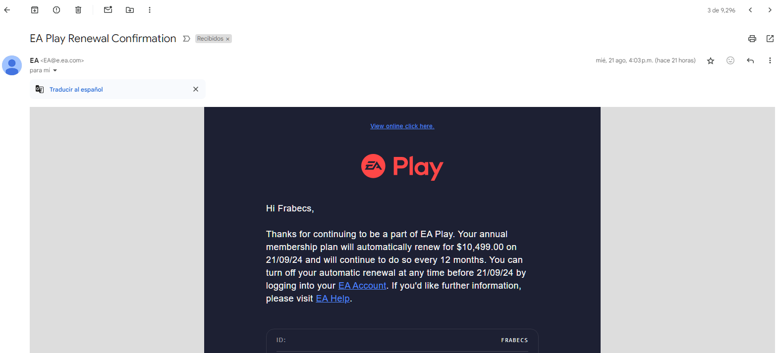 Yo pague mi suscripcion anual de ea play pro el 21/09/2023, es decir el mes proximo se me tendria que renovar pero este año se dolarizo la tienda, yo no tenia pensado volver a renovarlo ya que no puedo pagar 120usd mas impuesto. Pero hoy me llego un mail de que podia renovarlo automaticamente y me iba a salir 10.500 pesos, queria saber si esto es correcto ya que el mail me lo mandaron desde ea. Muchas gracias!, espero respuesta.