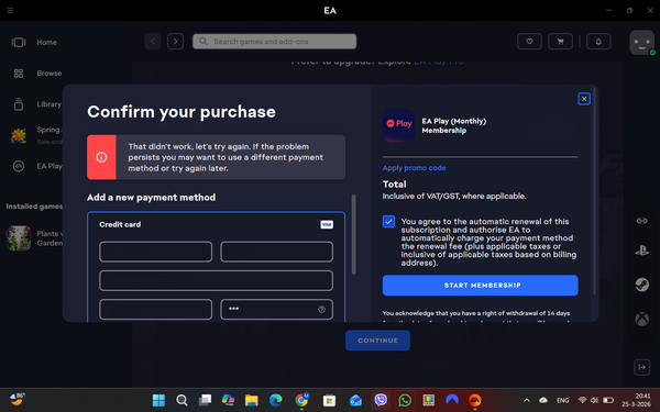 i tried to pay for ea play 1 month using playstation store web and ea app. and getting error message.
