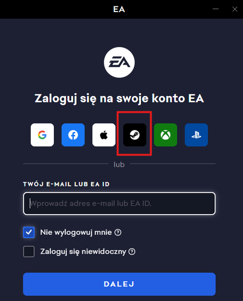 Dodatkowo wyloguj się z aplikacji EA a następnie zaloguj się za pomocą danych swojego konta Steam.