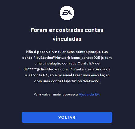 Boa tarde, tentei vincular minha psn a minah conta da EA mas dá um erro falando que ja esta vinculada a uma conta EA com esse email abaixo que não é o meu, gostaria de saber como faço pra desvincular...