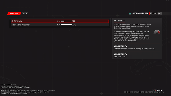 Steps: How can we find the bug ourselves? In an event that allows to use the tech level modifier, i.e under the solo & multiplayer events tab, increase the difficulty and then go to an event that is using real cars (F1 or F2 cars) i.e under the series tab, and you'll see that you are not able to change the modifier as there's no option for it.