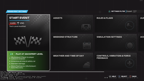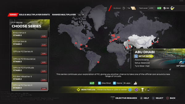 As can be seen in the image series below, if changing the tech level multiplier in the "solo & multiplayer events"-tab, you inadvertently change it for the "series" tab as well, without the ability to change it back. This makes the F2 races pretty much impossible to complete since the AI drivers have way higher straight line speed than the player car.