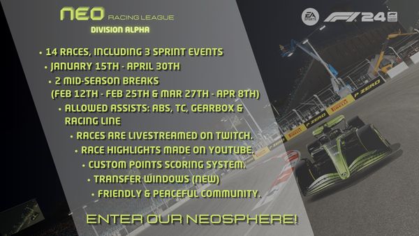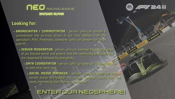We are a virtual racing (e-racing) league called NEO Racing League (or just simply NEO). Our upcoming Season 4 is one month away, and we're currently looking for the drivers to join our Division Alpha roster before January 15th, 2025, where our first race of the season in Las Vegas will take place! Important info is provided in our pictures below.