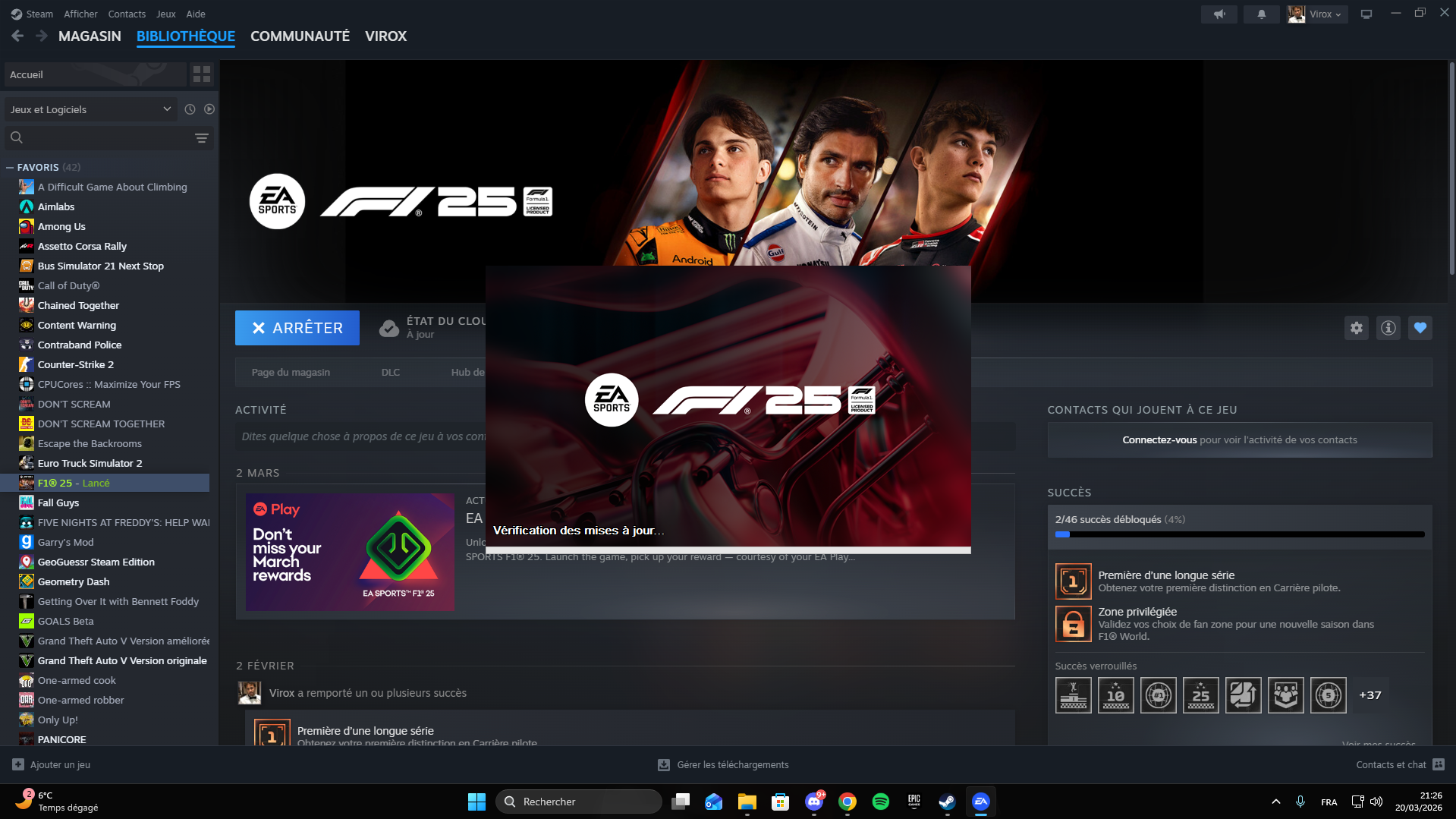 Bonjour, j'ai un problème depuis environ 2-3 jours, lorsque je lance F1 25 cette écran avec le lancement de l'Anti-Cheat s'affiche mais après cela mon jeu ne se lance pas et se ferme. J'ai 11 heures de jeu donc du jour au lendemain ce bug et apparu. Ce que j'ai réalisé :