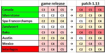 Until today. I'm currently struggling to keep the pace of the best players in Interlagos, especially in sector 2 where I need much more load (WR wings are 29-14, mine are 33-25!) but still wasn't understanding until I read this on X (link):This got me thinking, I went to check the compounds expected for each track that I saved at the game release and I found the differences below, which I don't know if they are specifically related to patch 1.13 or modified from time to time but the point is, each time you change (I guess) the soft compound for the track you change the performance in Time Trial too!!!