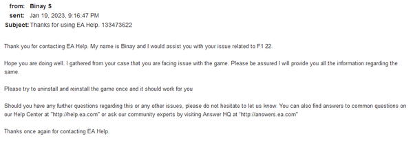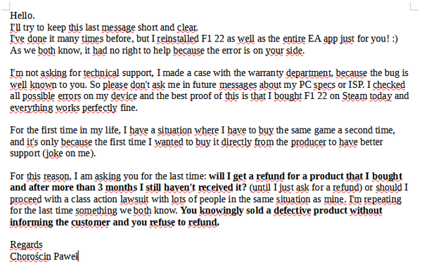 As I wrote in the last message to EA, I already bought F1 on steam and I don't have patience and time (becouse I have working game on steam) to continue this discussion anymore.