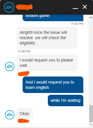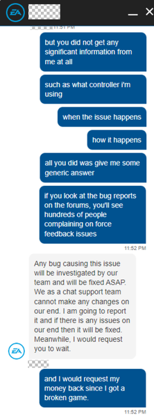 Of course I'm taking cheap shots at them. I just said I have an issue with the force feedback. And they asked me for my email, and said the issue will be forwarded. No further questions such as what controller, when does the issue occur, NOTHING. Just a generic answer that the issue will be resolved ASAP. How can you resolve something without knowing what it is ? That's the whole point. They are just an intermediary to the people who can actually change some. There's no point in getting upset at them. They pass along the message. If you ask questions like "when will this be fixed", how on earth are they supposed to know? They're not programming the game. They have to sit there and take the abuse thrown at them by players frustrated at EA's lackluster programming.