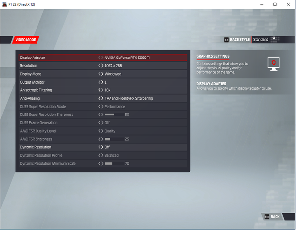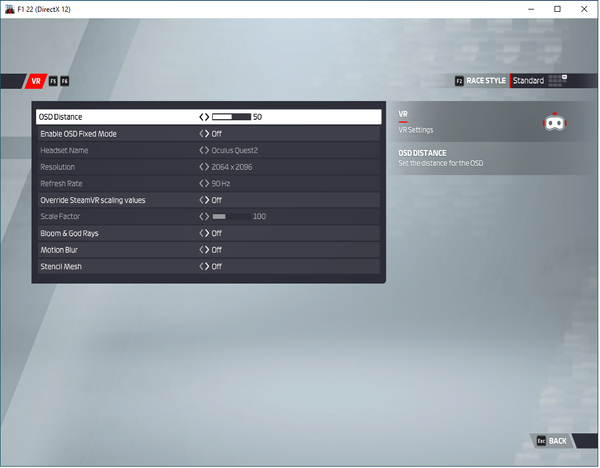 With this settings I got stable 89 fps. There were little bit lower fps while driving near pit boxes and also at the start of the race (44 fps). There were no freezing or jittering with head movement. I think it would be possible to increase some of the graphics settings ingame. Disabling dynamic resolution and Stencil Mesh helped a lot.