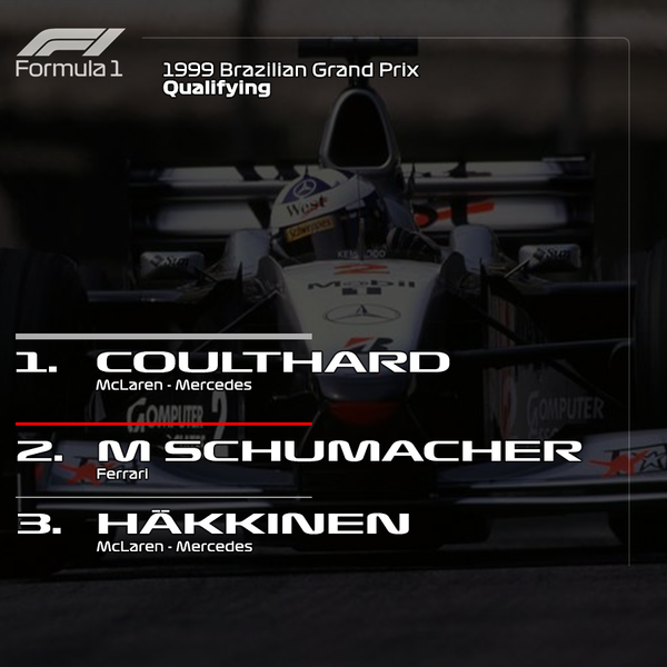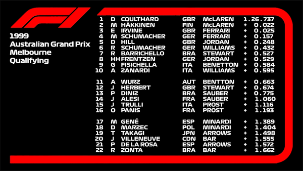 First Pole Position of the season goes to David Coulthard! In a very close qualifying session, the Scotsman was only just slightly faster than team mate Mika Häkkinen and Ferrari's Eddie Irvine. Michael Schumacher came in 4th at .157s. Damon Hill saw a good recovery from his disappointing practice session coming in 5th, while Alex Zanardi made the top 10.