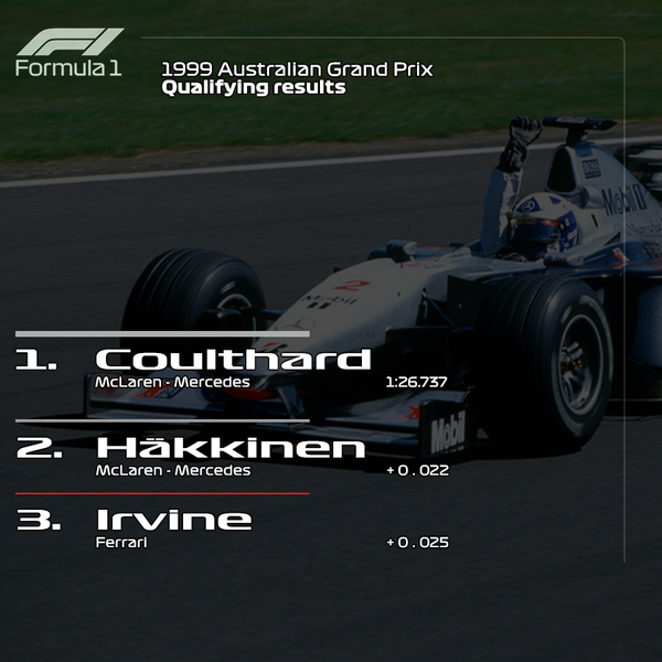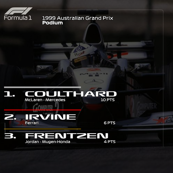David Coulthard has converted his pole position into a race win! The opening race of the 1999 season is therefore prey to McLaren, which is there 117th race win; only two wins shy of the all-time record by Ferrari.