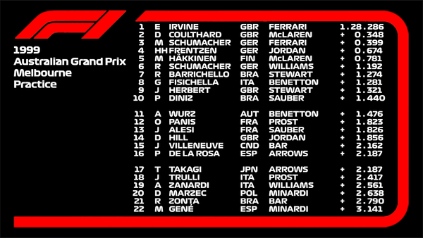 Eddie Irvine noted the fastest time during the first session, of the first race weekend. The driver from Northern Ireland was almost .35s faster than David Coulthard and nearly .4s quicker that team mate Michael Schumacher. Defending world champion Mika Häkkinen came in 5th at .781s.