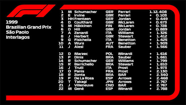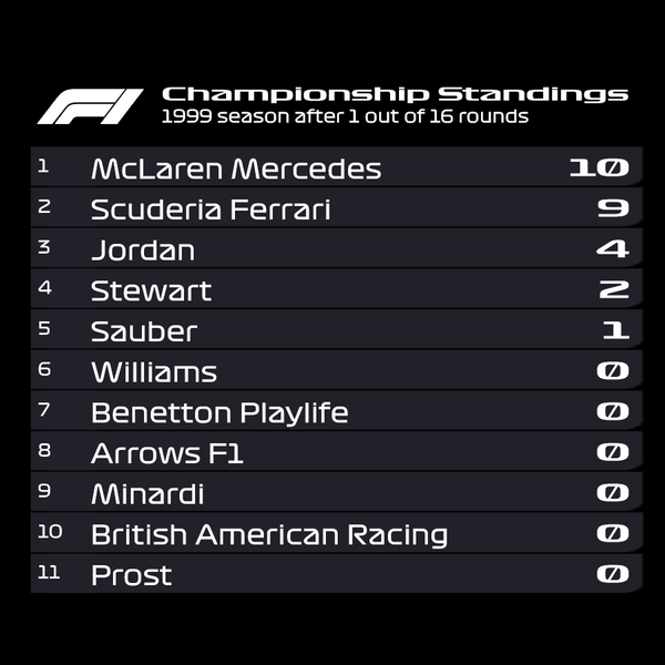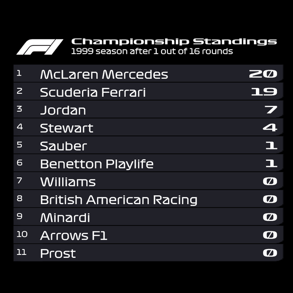 Even though Schumacher and Häkkinen did not get a result that resembled their speed, it is clear already after one round that the 1999 championship will be between winners McLaren and runners-up Ferrari. The next race is on Autodromo José Carlos Pace in Interlagos, São Paolo, Brazil where rain could become a key factor.