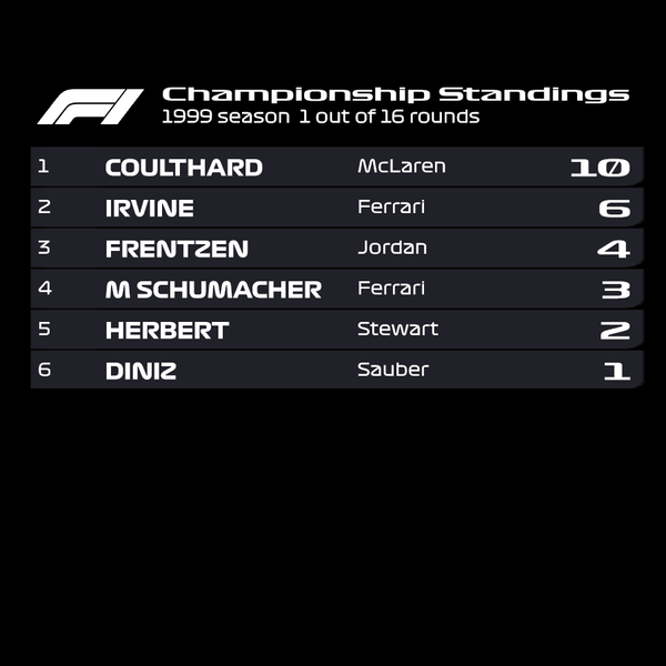 Because we're back in 1999, only the top 6 drivers are rewarded with points (10 points for 1st, 6 pts for 2nd, 4 pts for 3rd, 3 pts for 4th, 2 pts for 5th and a single point for the one coming home in 6th. All other results are done on countback of the highest finishing position outside of the point. Example: because Daniel Marzec brought his Minardi home in 13th, the team is in front of BAR (one car finished in 14th) and Prost (one car finished in 16th). This principle also applies to the drivers.