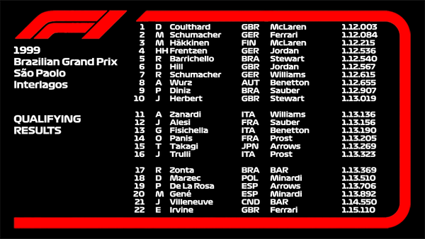 McLaren hits back! David Coulthard claimed pole position again, staying .081s ahead of Michael Schumacher. While the double world champion of 1994 and 1995 could battle with his McLaren rivals, Eddie Irvine suffered technical issues - The driver from Northern Ireland will have to start from the back of the grid.