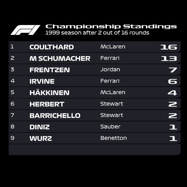 After two races in the 1999 season, David Coulthard leads Michael Schumacher 16 to 13 when we are heading towards Imola, which could be seen as the home circuit for both Italian teams, Ferrari and Minardi. McLaren holds one point over Ferrari in the Constructors Championship (20 - 19).