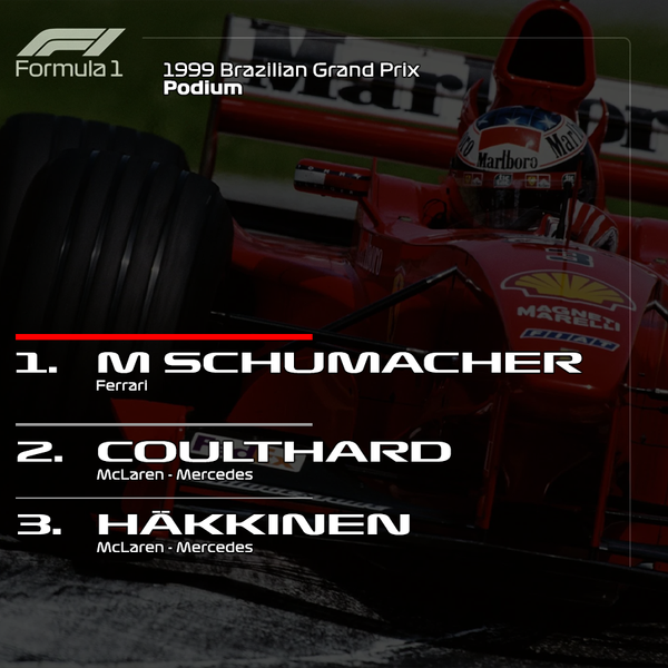 Michael Schumacher took the lead in the first corner and never looked back. The German took his 34th race win in his career, a 120th for Scuderia Ferrari. McLaren finshed 2nd and 3rd with David Coulthard and Mika Häkkinen and also score 10 points and keep the lead in the 1999 Constructors Championship.
